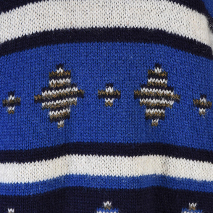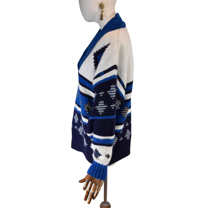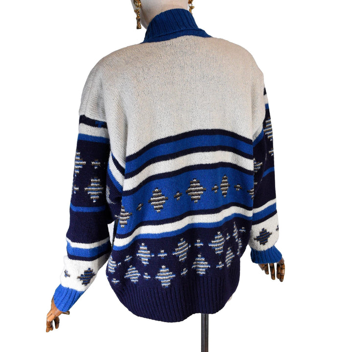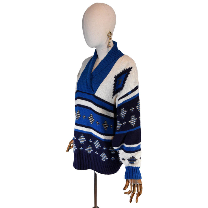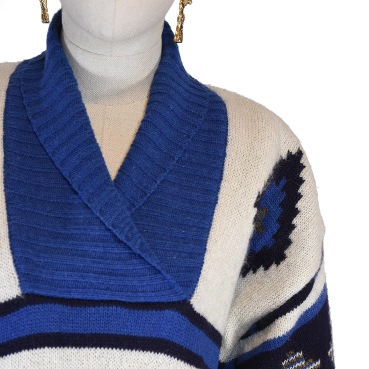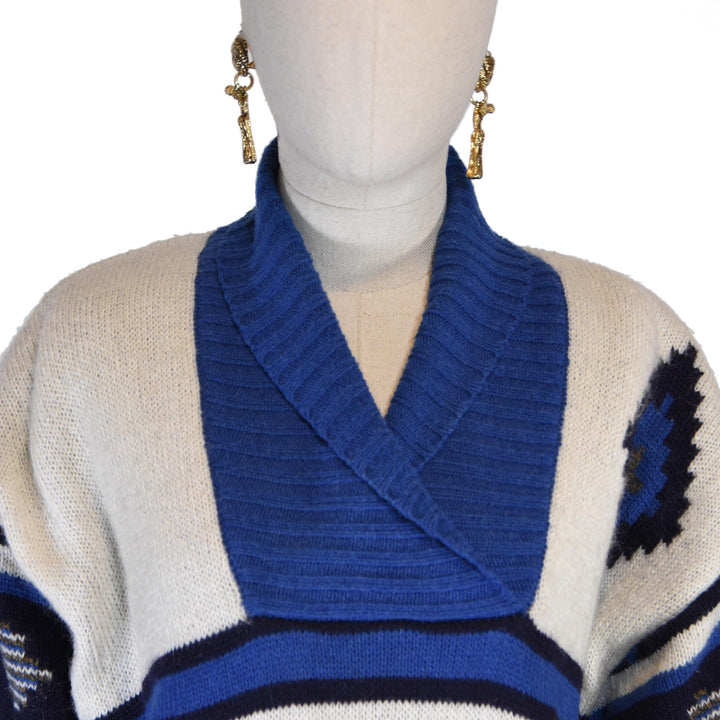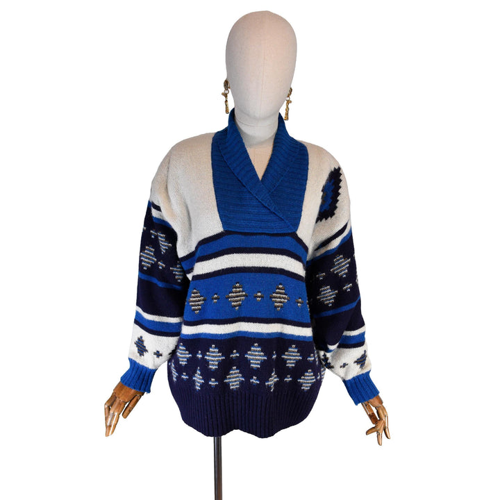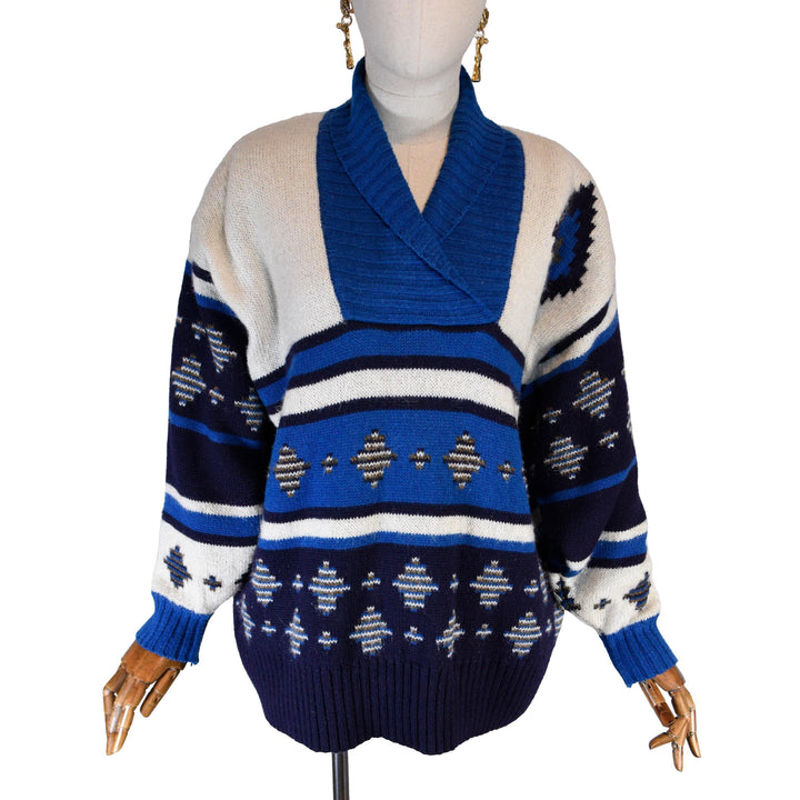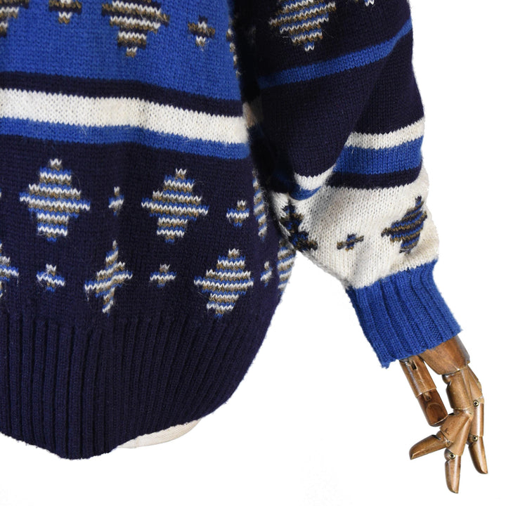 Wrap yourself in the softness of this vintage 80s sweater from LAUREL, made from a blend of wool and mohair with a striking geometric pattern. Wool and mohair are natural fibers known for their warmth and soft texture, offering cozy comfort, perfect for colder days.